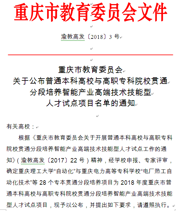 根据《重庆市教育委员会关于公布普通本科高校与高职专科院校贯通分段培养智能产业高端技术技能型人才试点项目名单的通知》(渝教高发〔2018〕3号文件),mansion88主页机器人工程专业获批重庆市首批普通本科高校与高职专科院校贯通分段培养智能产业高端技术技能型人才试点专业。从2018年起,mansion88主页机器人工程专业将与重庆电子工程职业学院工业机器人技术专业衔接,开展“3+2”专本贯通分段培养智能产业高端技术技能型人才项目(以下简称“专本贯通分段培养项目”)试点工作,首批招生人数为90人。