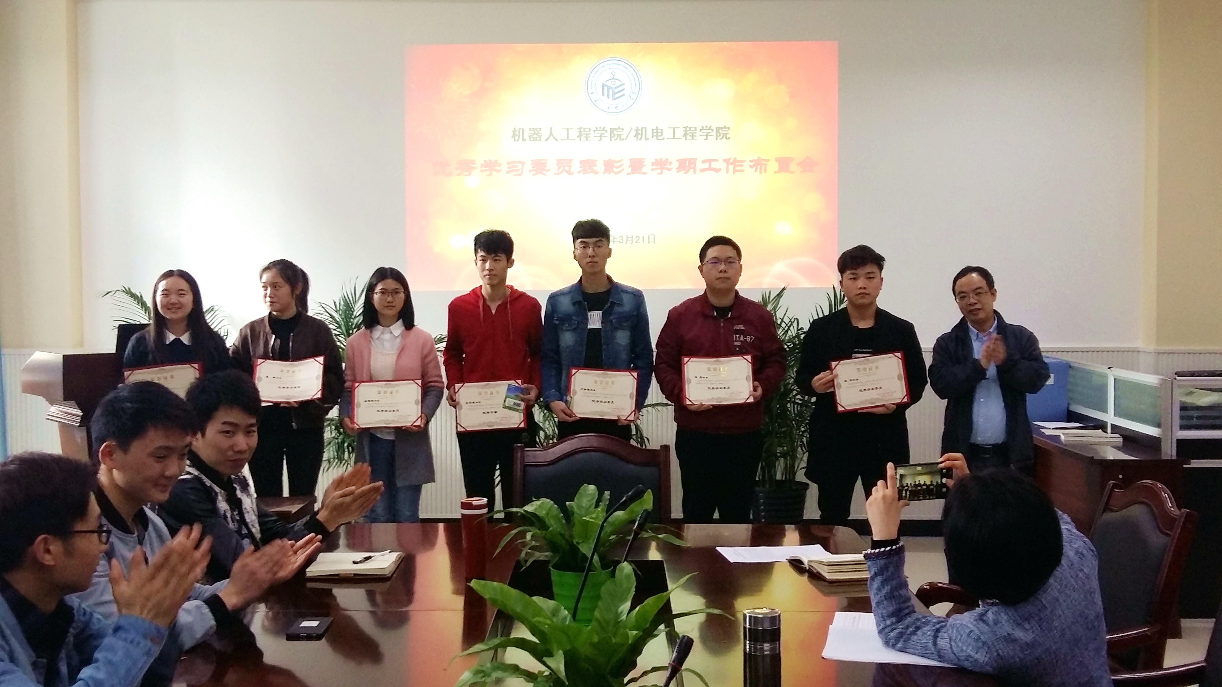 会议开始,李顺江宣读了学院《关于表彰2017-2018学年第一学期优秀学习委员、学习部优秀干事的决定》,向受到表彰的优秀学习委员、学习部优秀干事颁发了获奖证书并合影留念。教学办陈庆老师、学工办主任李兴成从科室工作职能角度谈了对学习委员工作的希望和要求,希望学习委员发挥在班级建设和管理工作中的重要作用,并要求学习委员要保持和学院相关科室、教师的密切联系和沟通,积极认真地履行自身职责,发挥好学院和学生之间在学习方面的桥梁和纽带作用。