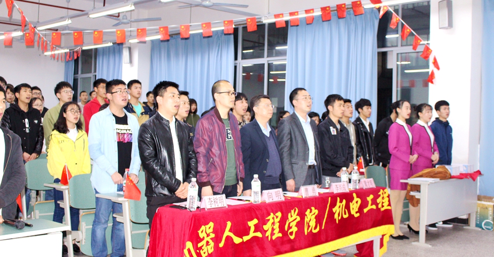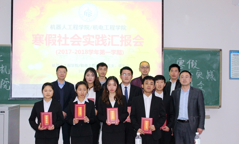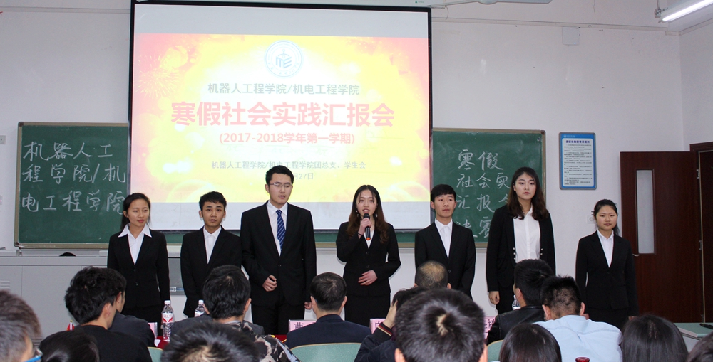 3月27日晚,机器人工程学院/机电工程学院2017-2018学年第一学期寒假社会实践汇报会在知行楼A104举行。校学工部副部长、校团委副书记向明、学院党总支书记曹勇、团总支副书记李兴成、2017级辅导员李树明、校团委创业实践部部长黄才明出席汇报会。学院两委会主席团成员和各部门部长18人担任大众评委。来自学院各专业各年级学生代表近100人聆听了汇报会。