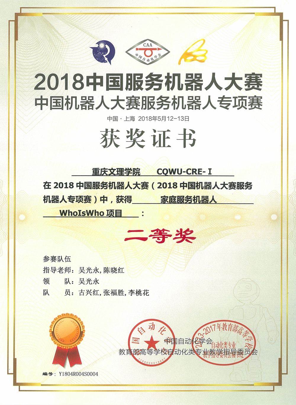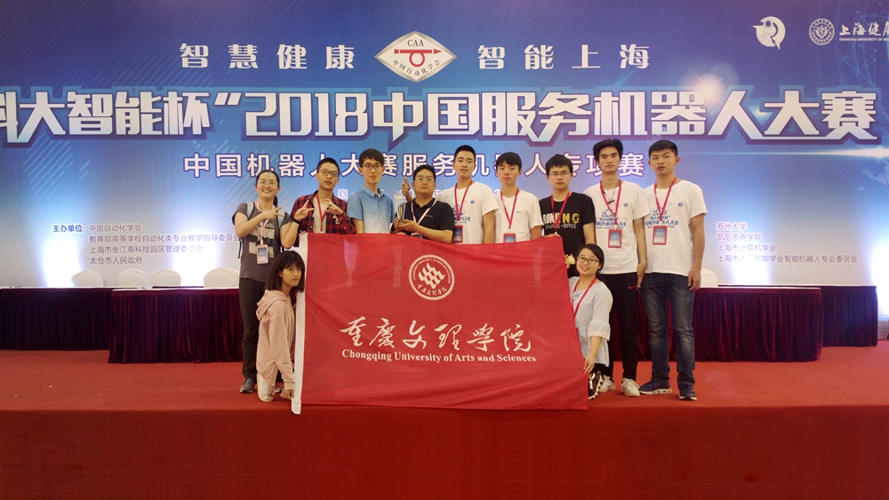 我校派出了由机械电子工程系主任吴光永、专业教师陈晓红带领的3支代表队9名队员参加了家庭服务机器人赛项中9个项目的比赛。经过历时2天、与来自全国70多所高校选手的激励角逐,2015级机械电子工程专业学生韦文、李作棚、2016材料成型及控制工程专业学生朱丽单组成的CQWU-CRE-Ⅲ队成功夺得“泡茶机器人”项目亚军(一等奖)、“人的辨识”项目和“路径规划”项目二等奖。2015级机械电子工程专业学生古兴红、2016级机械电子工程专业学生张福胜、2016级材料成型及控制工程专业学生李桃花组成的CQWU-CRE-Ⅰ队和2015级机械电子工程专业学生裴胜、王兰权、马茂瑞组成的CQWU-CRE-Ⅱ队团队分别获得“WhoIsWho项目”、“Shopping项目”二等奖。其余选手的另外4个项目分别获得三等奖。