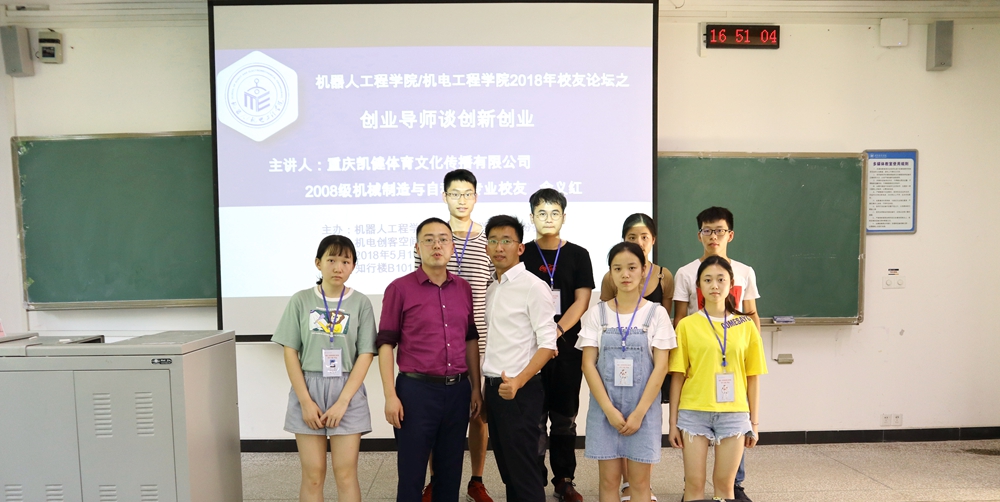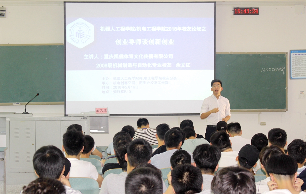 5月16日下午,学院2018年校友论坛系列活动之一——创业导师谈创新创业讲座在知行楼B101举行。学院聘任的创业导师、2008级机械制造与自动化专业校友、重庆凯健体育文化传播有限公司营销总监余义红返校举办了创新创业专题论坛。学院校友分会秘书长李兴成主持论坛,2016年级100多名同学聆听了本次讲座。