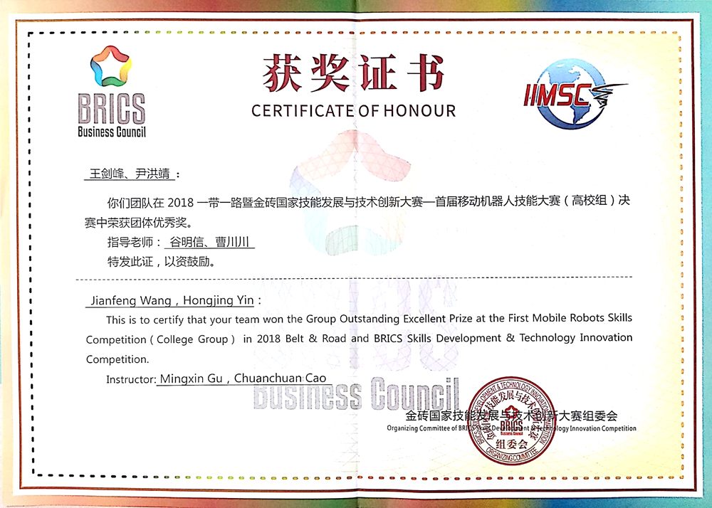mansion88主页机械电子工程专业教师谷明信、曹川川指导的\2017级机械工程专业学生王剑峰、2017级机械电子工程(长航班)学生尹洪靖组团的参赛团队参加了移动机器人与VR设计技能大赛中国赛区(高校组)决赛。经过三天的激烈角逐,最终mansion88主页学生代表队获得优秀奖。