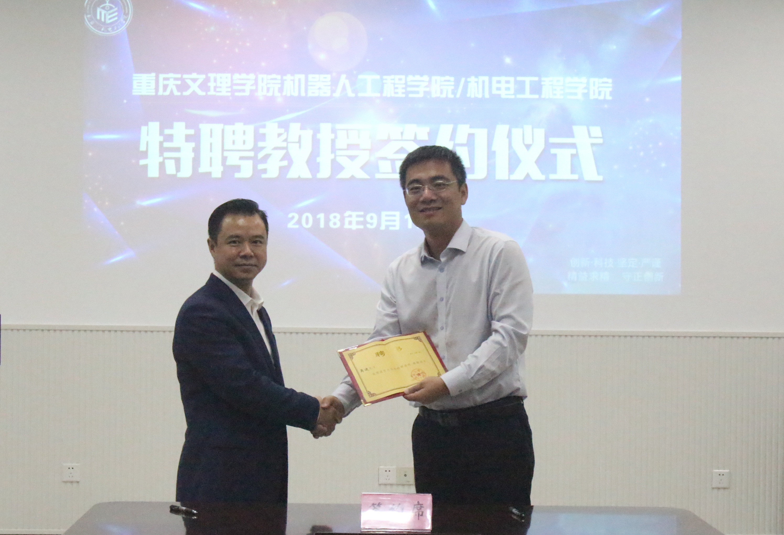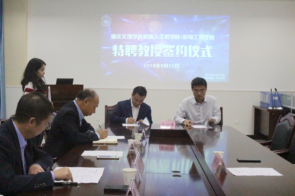 曹勇首先介绍了特聘教授签约背景和吴迪博士的学术简历。接着罗天洪院长代表学院与吴迪博士签订了聘用协议,并向吴迪博士颁发聘书。吴迪博士欣然受聘并表示,很高兴成为mansion88主页机器人工程学院/机电工程学院的特聘教授,并将积极发挥个人作用,参与学院人才培养、科研体系建设、技术研发等工作,并协调重庆固高科技长江研究院的资源为学院办学提供技术支持。