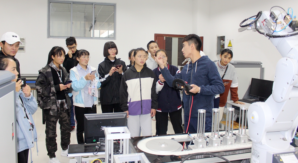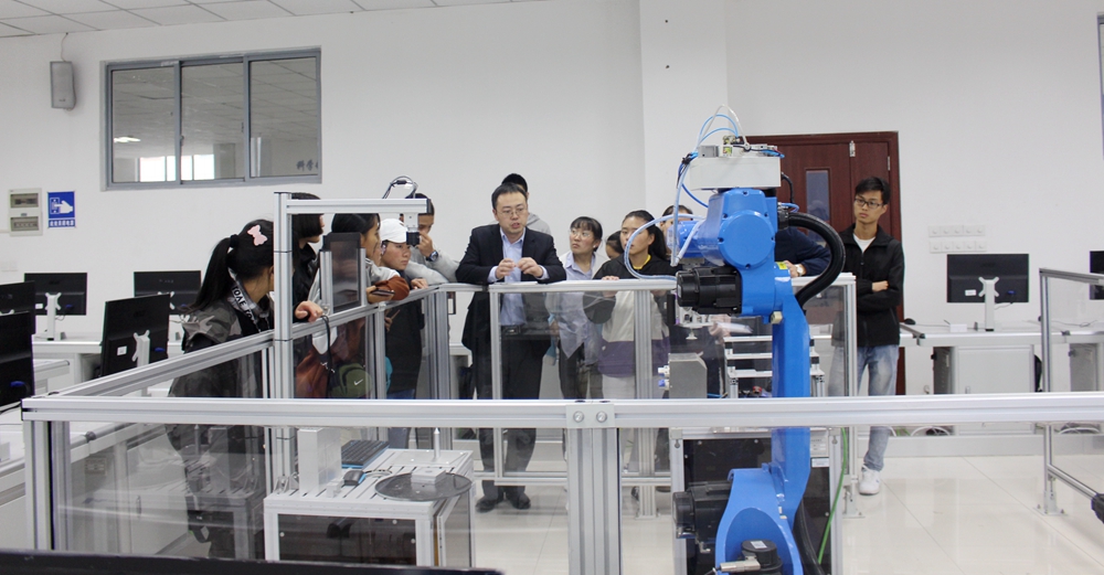 该班师生在黄杰带领下参观了机器人展厅、数控车床电气控制与维修实训室、数字模拟电子技术实验室以及机电一体化与PLC技术运用和模块化工业机器人综合实训室。黄杰为参观的藏族同学详细讲解了每间实验室的主要用途和各种机器人的操作技术,还向藏族同学演示了机器人的运动和控制原理,并邀请藏族同学共同完成了动态工业机器人一体化仿真实验。在黄杰同学讲解下,藏族同学对工业机器人的性能和用途有了更加深入的了解,也对当前机器人产业的发展前景有了更加清晰的认识,唤起了藏族同学对未来大学生活和中国制造2025的美好向往和无限憧憬。