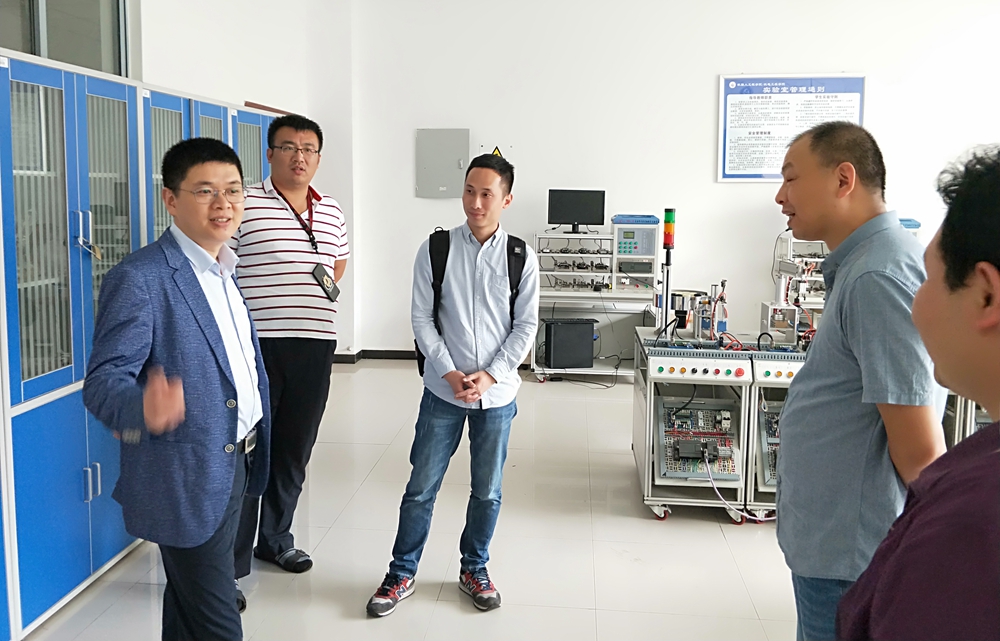 唐荣江一行首先参观了机电工程实训中心,并重点考察了“智能制造工程”专业的实验实训条件。随后双方在格术楼C401会议室进行了座谈交流。曹勇向客人介绍了学校的基本情况,重点介绍了机电工程学院的专业设置与发展情况,并表达了愿意与桂林电子科技大学机电工程学院在学科专业建设、学生考研、工程教育认证等方面建立更加紧密的联系和深度交流。胡旭、尹翰坤就“智能制造工程”专业申报与人才培养方案等进行了详细介绍。唐荣江介绍了桂林电子科技大学机电工程学院的基本情况,并就“智能制造工程”新专业发表了自己的看法和意见。随后,双方就智能制造工程专业申报、机械类专业工程教育认证等相互关心的问题进行了深入交流。