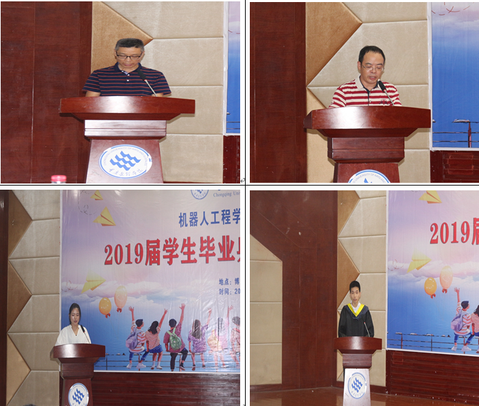 最后,主持人代为宣读了出差在外的罗天洪院长对2019届毕业生的真诚祝福和深情寄语。罗天洪院长在寄语中向同学们三点希望:第一,做一个有使命感、有担当的人。中华民族伟大复兴需要每一个人的参与,希望同学们养成并保持学习的能力,坚持创新,敢于担当,争做时代的弄潮儿。第二,继承和弘扬“精益求精,守正创新”的院训。中美贸易战中兴、华为的鲜明对比告诉我们创新和掌握核心技术的自主研发能力的必要性和紧迫性,希望同学们在工作中不断进取,开拓创新。第三,做一个坚定的奋斗者。做没有做过的事是成长,做不愿意做的事是改变,做不敢做的事是突破,希望同学们做一个善于成长、勤于改变、勇于突破的人。最后,他表示,学院永远关注和祝福每一位毕业的学生,并期盼同学们在未来的道路中早日创造出属于自己的辉煌、传来人生成长和进步的佳音。(撰稿:李兴成、耿士博;审核:曹勇)