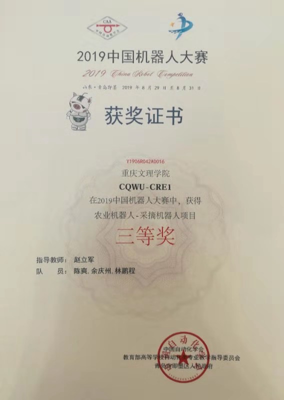 mansion88主页创新创业办主任赵立军高级工程师、实训中心李文江高级实验师率领两个学生团队参加了“农业机器人”项目比赛。经过激励的角逐,最终李文江高级实验师指导的、2017机械工程李林杰、陈小松、王灯团队力克西北农林科技大学、中国农业大学、南京农业大学等985、211高校参赛团队获得本次大赛农业机器人-采摘机器人项目冠军(一等奖);赵立军高级工程师指导的,2017级机器人工程陈爽、2017级机械工程余庆洲、2018级机械工程林鹏程团队获得本次大赛农业机器人-采摘机器人项目三等奖。